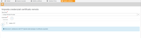 - Se il certificato non è con OTP si dovrà indicare l'Utente delegante