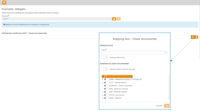 Inserita la password, sarà abilitato il tasto che permette di selezionare l'AOO e le classi documentali su cui si vuol abilitare il certificato di firma.