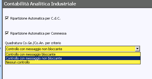Impostare nelle opzioni, se desiderato, l'attribuzione automatica dei Centri di Costo ed il controllo di quadratura tra i dati contabili ed analitici: