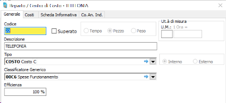 Compilare l'anagrafica dei centri di costo, Area BASE → Tabelle Generali e Calendari → Reparti/Centri di Costo → Reparti / Centri di Costo Interni