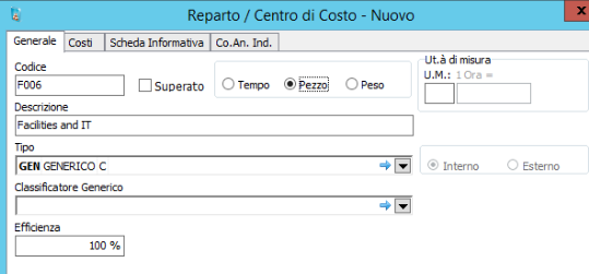 Compilare l'anagrafica dei centri di costo, Area BASE → Tabelle Generali e Calendari → Reparti/Centri di Costo → Reparti / Centri di Costo Interni