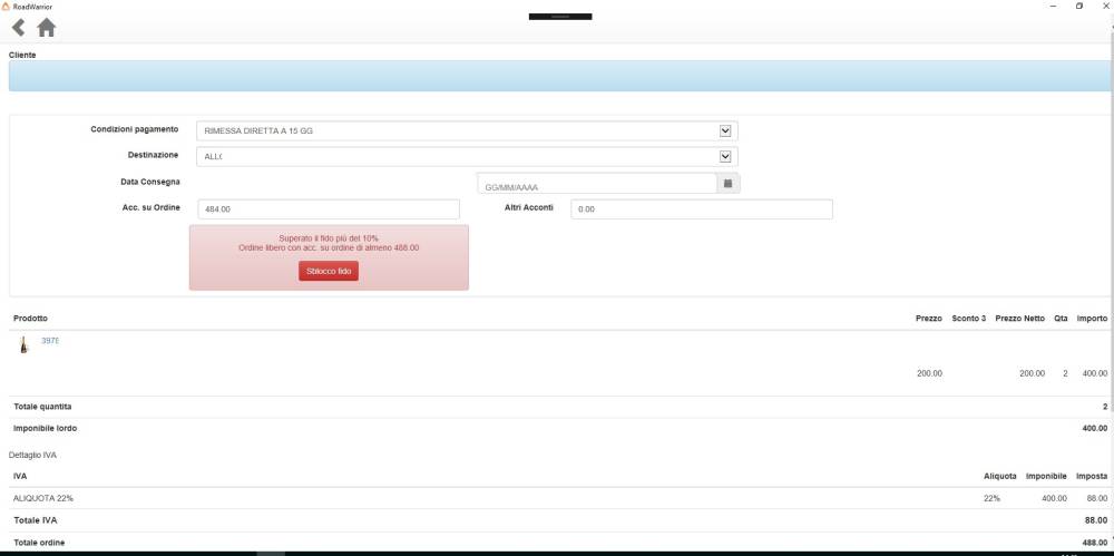 In tal caso per inserire l’ordine l’agente deve utilizzare anche lo “Sblocco scoperto” per poter inserire l’ordine.