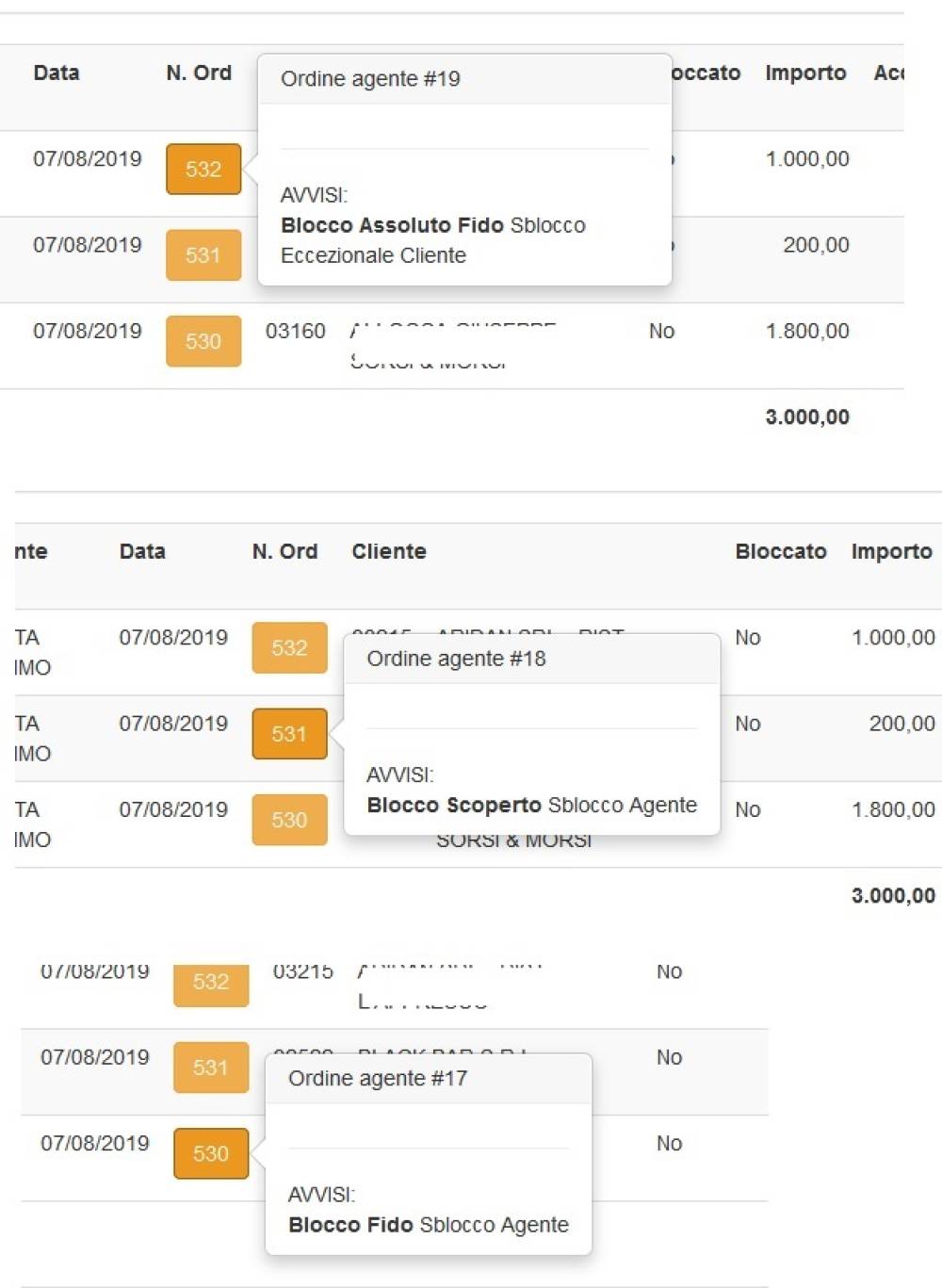 Nella pagina Ordini sarà possibile riconoscere gli ordini che hanno avuto un avviso di sblocco dato che il bottone N.Ord si colorerà di Giallo. Cliccando sul bottone appariranno altre alle eventuali note, se presenti, anche le descrizioni delle motivi di avviso e degli sblocchi utilizzati per procedere all'inserimento dell'ordine