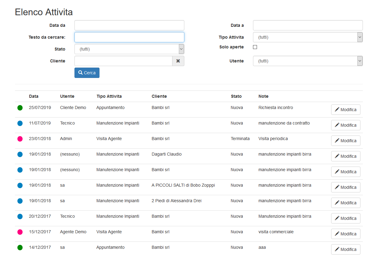Le funzioni di ricerca permettono di selezionari gli eventi in funzione del tipo, dello stato o del cliente interessato.