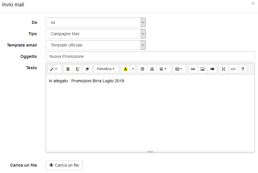 Una volta selezionati i soggetti destinatari è possibile compilare il testo della mail ed allegare file contenenti promozioni o comunicazioni aziendali.