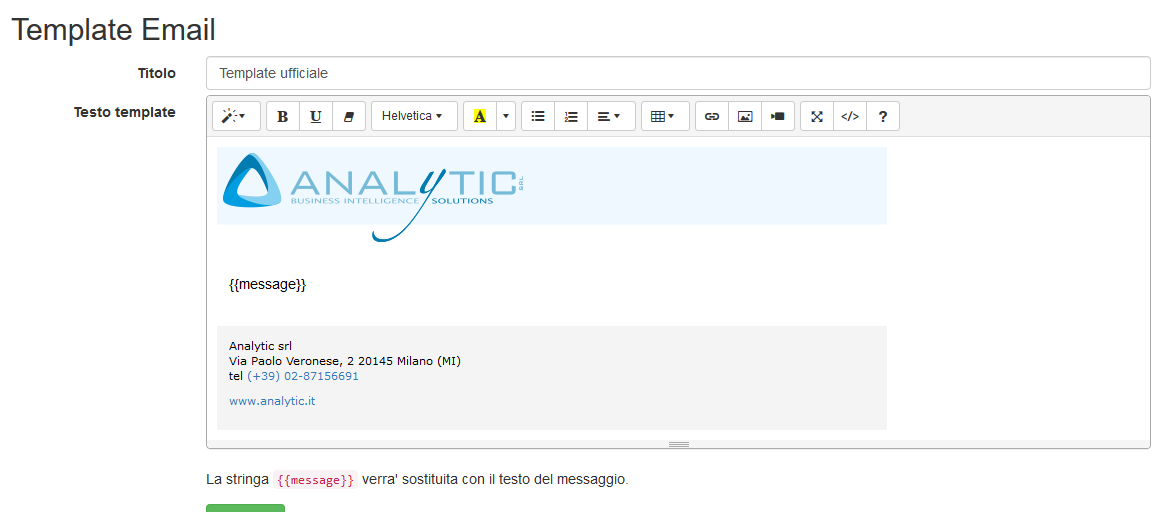 Il gestore dei template permette di definire uno o più Layout, personalizzando ogni elemento del messaggio in modo da renderlo efficace e rispettare gli stili di comunicazione dell'azienda.