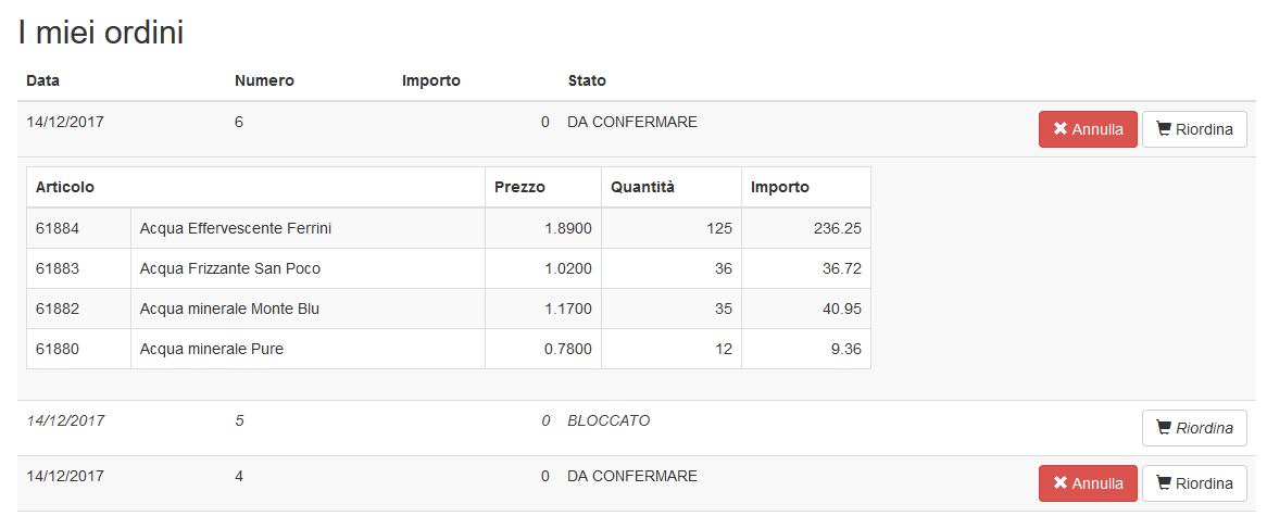 Per visualizzare l'elenco e lo stato degli ordini inseriti bisogna utilizzare la funzione “I miei ordini”. Se si preme su una riga dell'elenco viene mostrato in linea il dettaglio dell'ordine, se l'ordine non è stato ancora evaso è possibile annullarlo premendo il pulsante apposito. Infine è possibile utilizzare il pulsante “Riordina” per compilare un nuovo ordine partendo da uno già inserito.