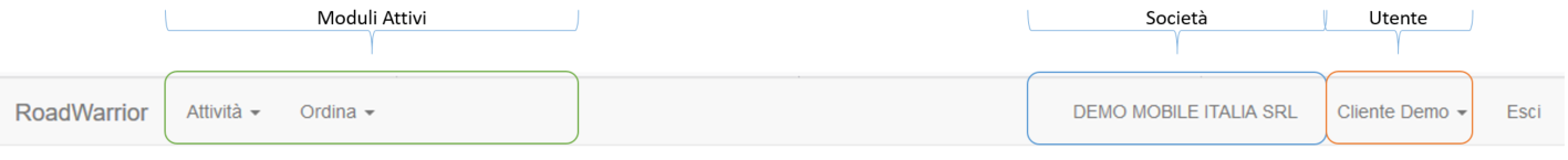 Ad ogni utente, in base ai moduli attivati ed alla tipologia di utente, viene mostrato una barra dei menù personalizzata con le funzioni disponibili. Per tutti gli utenti nella parte destra vengono visualizzate il nome della società ed il nome dell'utente connesso. Nella parte sinistra del menù, cliccando su “RoadWarrior” si ritorna alla pagina principale dell'applicazione, che è anch'essa personalizzata per utente in base al modulo utilizzato più di frequente.