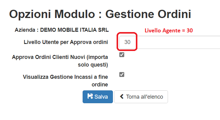 Inoltre bisogna specificare per <Livello Utente per Approva ordini> il livello per gli Agenti (30)