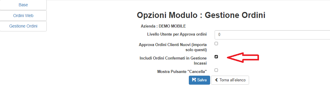 Premessa: Per vedere il menu della gestione incassi/scadenze/distinte è necessario abilitare il modulo “Gestione Ordini” nei parametri dell'utente. Previa abilitazione nei parametri azienda