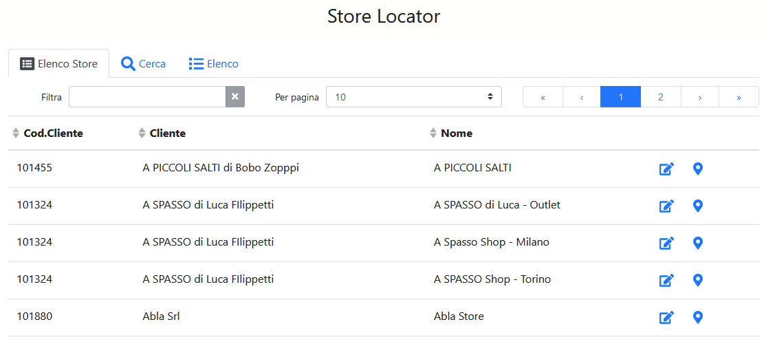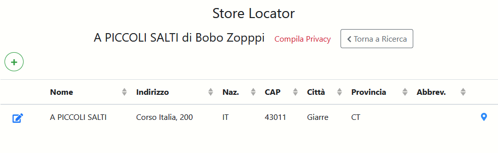 L'elenco degli store può essere filtrato in base al nome o ai campi principali dell'indirizzo (città,provincia,cap) in modo da identificare i negozi vicino ad un'area di interesse o poter rispondere alla richiestga diun potenziale cliente.