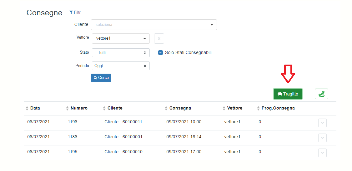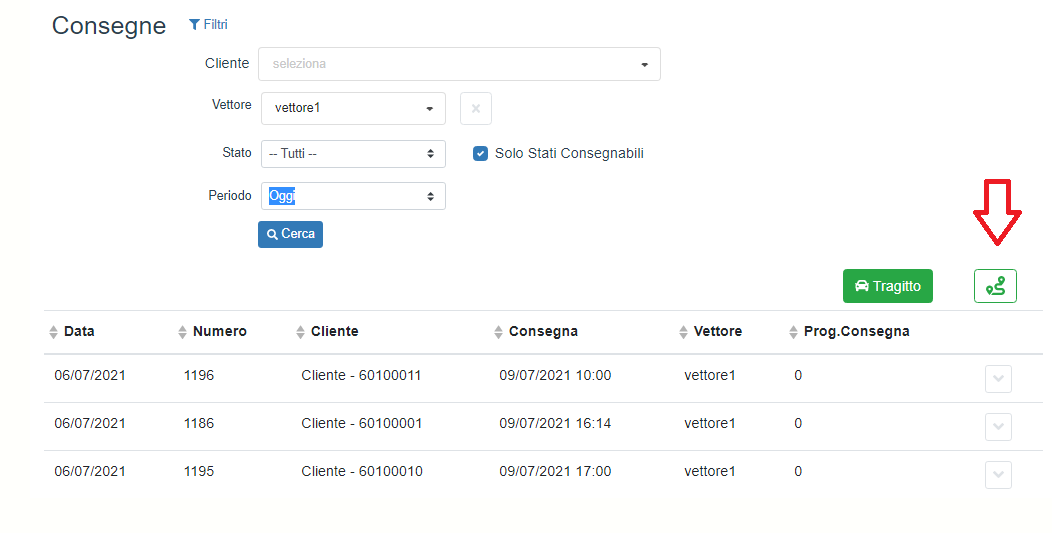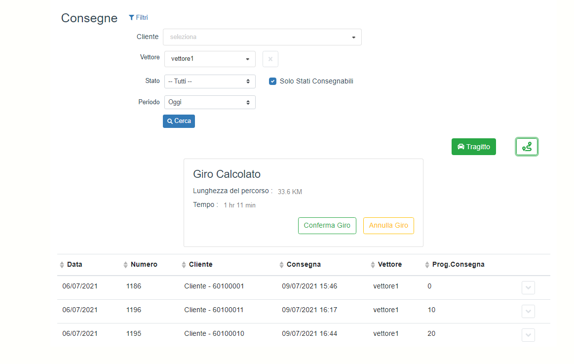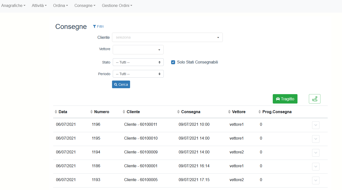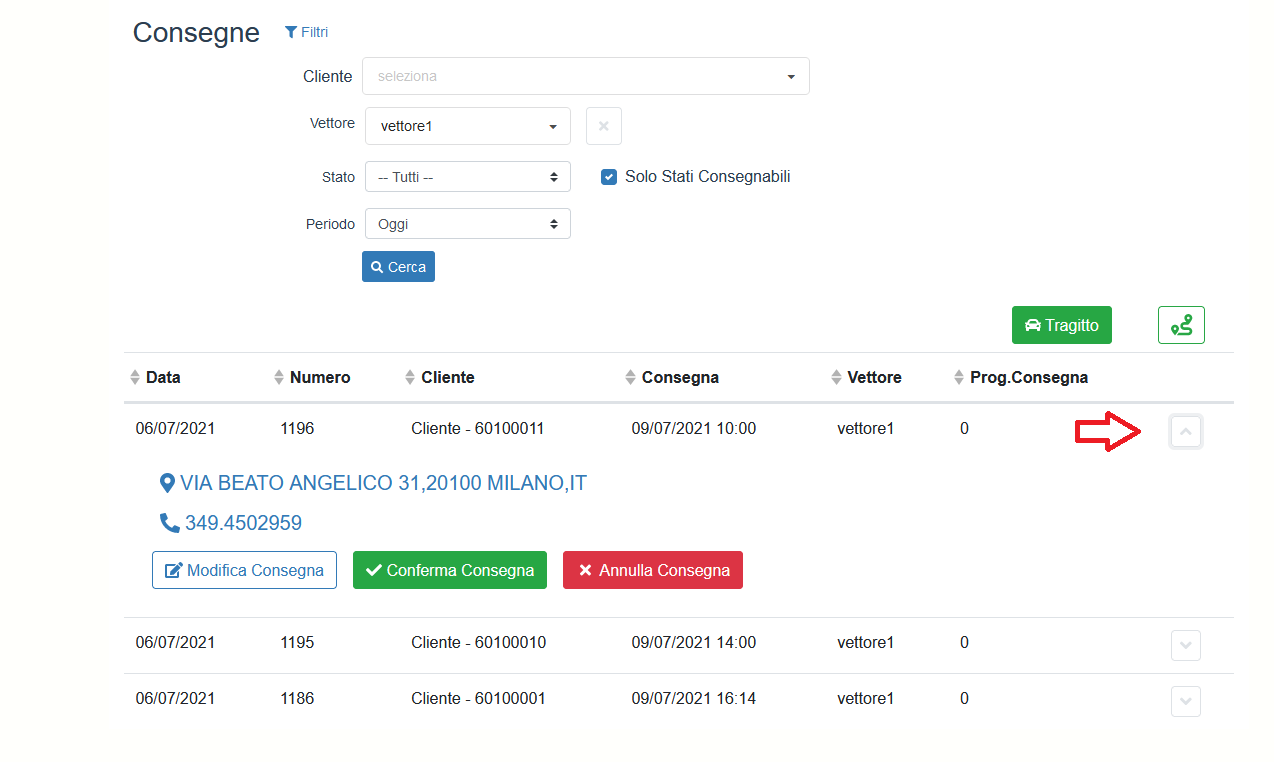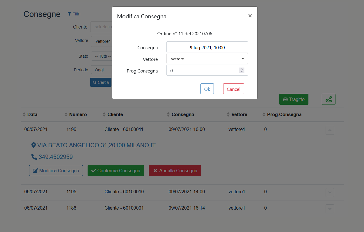 Operando una selezione sui filtri ad esempio: selezionando un vettore e gli ordini in consegna oggi, si otterrà l'elenco. Quindi utilizzando l'apposito bottone si può aprire la sezione per la visualizzazione e modifica dei dati.