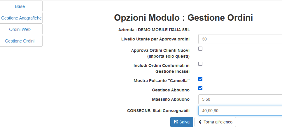 Per gli stati degli ordini, è possibile configurare quali stati si intendono “consegnabili”. Questo è fatto nella maschera Opzioni Modulo di gestione Ordini