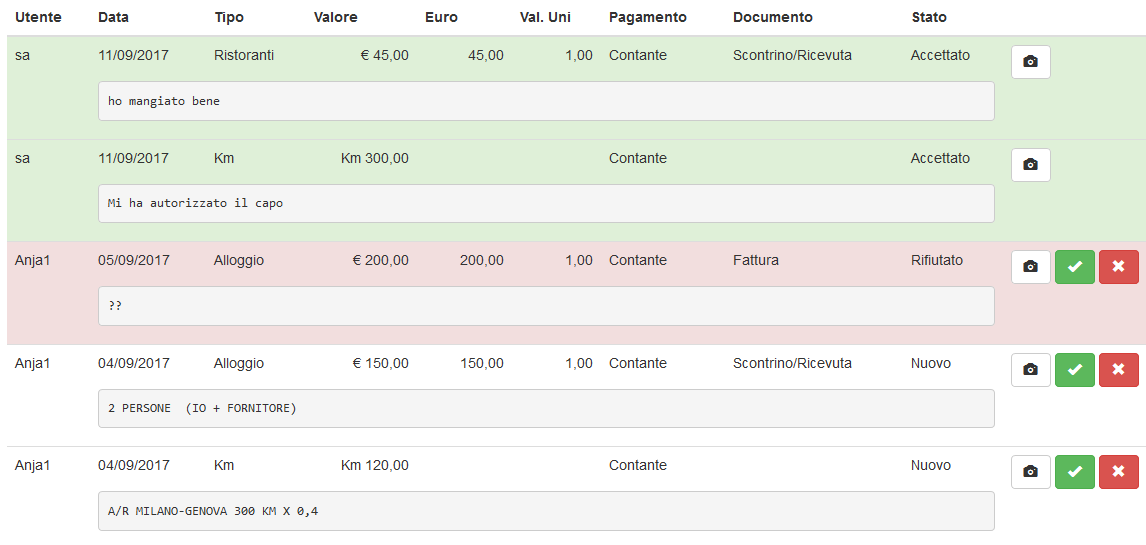 L'elenco delle spese contiene tutte le informazioni inserite dall'utente, un pulsante per vedere l'immmagine della ricevuta della spesa, lo stato di approvazione ed i pulsanti per accettare o rifiutare le singole spese.