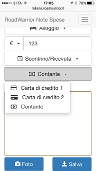 Per completare la registrazione, selezionare la modalità di pagamento (nel caso in cui l'utente disponga di una carta di credito aziendale), allegare se necessario una foto dello scontrino/ricevuta e premere il pulsante salva :
